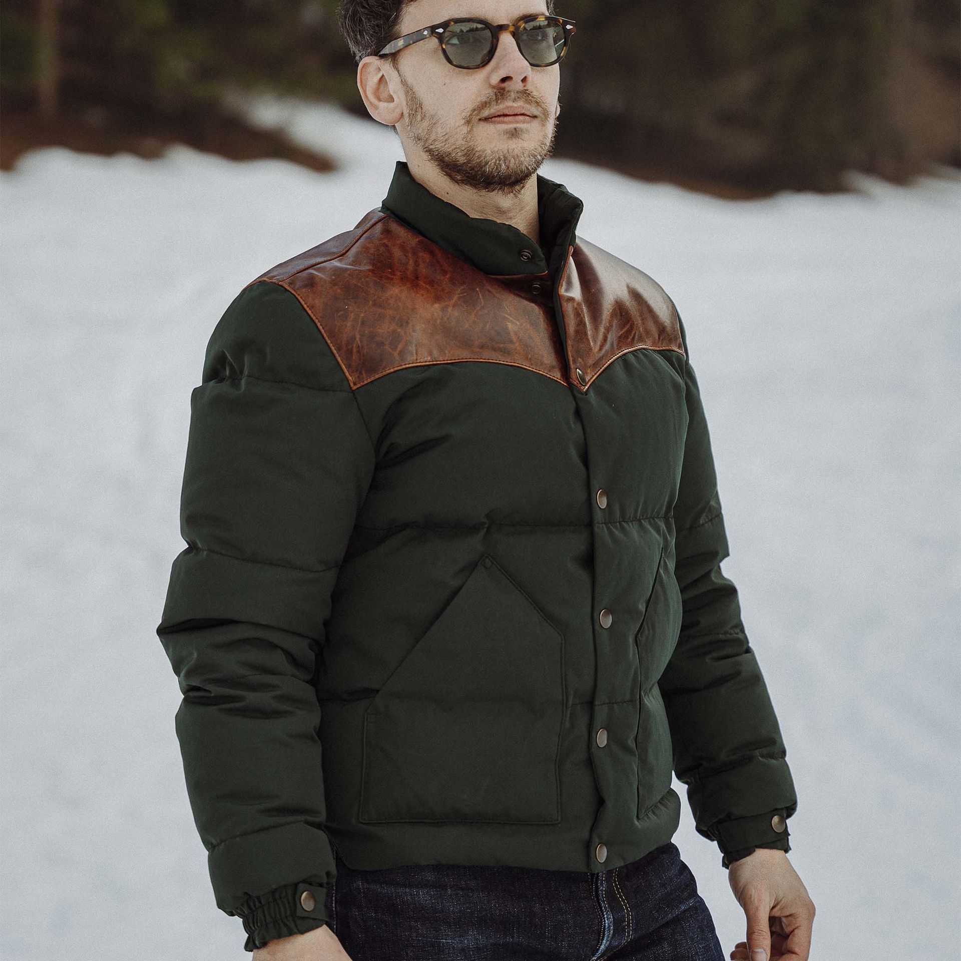 Inspirée des vestes de cow-boy des années 1960 et revisitée avec une touche italienne unique, la veste en duvet western Forest "Bivacco" représente un vêtement authentique fait de 80% de duvet d'oie recyclé / 20% de plume de Toscane (Italie) avec l'empiècement western traditionnel fait avec du cuir de cheval Front Quarter Pull-up de Charles F. Stead, l'une des plus anciennes tanneries du Royaume-Uni (depuis les années 1890 à Leeds, Royaume-Uni).