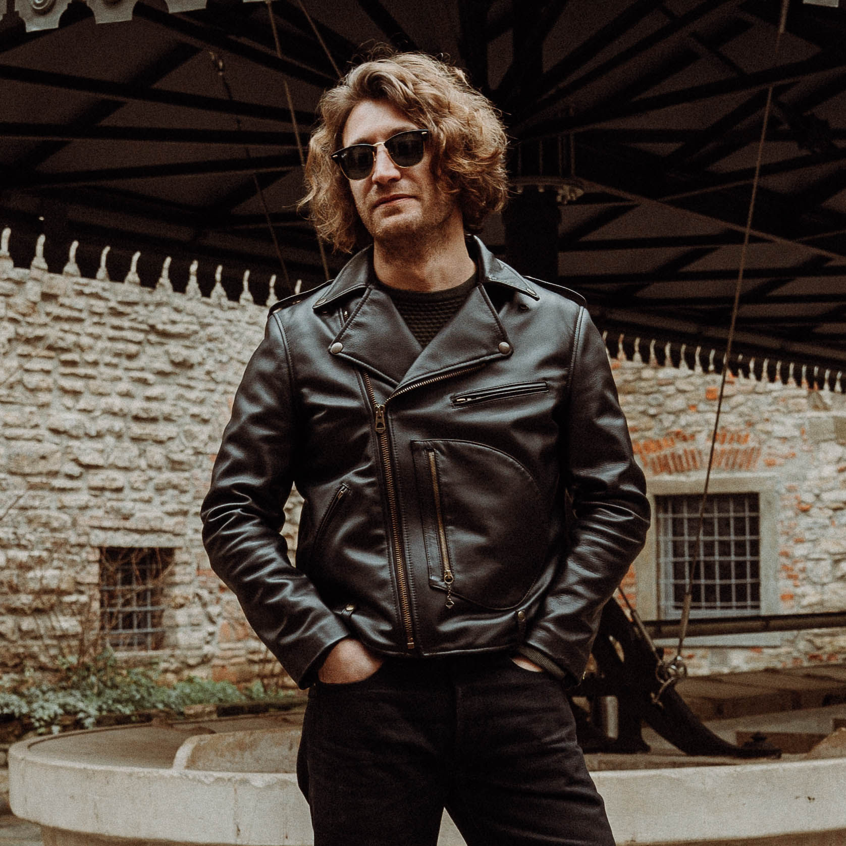 Inspirée des blousons de moto des années 1950 et revisitée avec une touche italienne unique, la veste en cuir de bœuf noir "Chiodo" représente un vêtement authentique en cuir de bœuf pleine fleur tanné au chrome et teint au tambour, provenant de Vicenza (Italie).